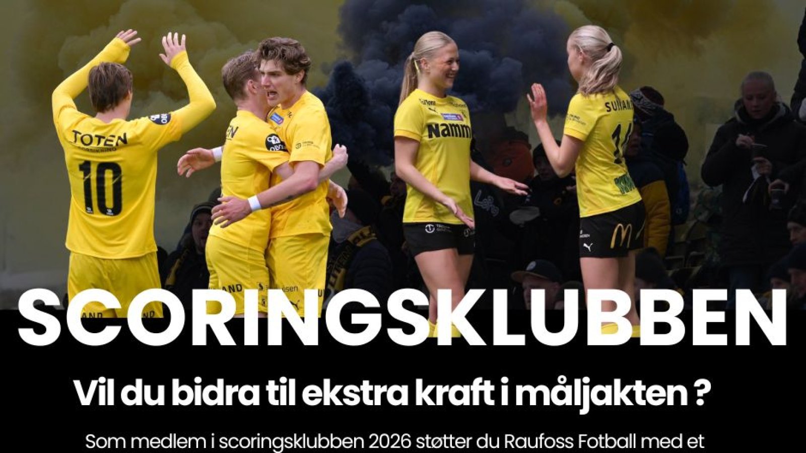 Vil du bidra til ekstra kraft i måljakten kommende sesong? Som medlem i scoringsklubben 2026 støtter du Raufoss Fotball med et valgfritt beløp per mål laget scorer i serie- og cupspill sesongen 2026. Målklubben er gjeldene for A-lag kvinner og herrer.